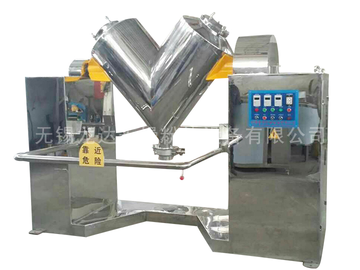 本機(jī)一端裝有電機(jī)與減速機(jī),電機(jī)功率通過皮帶傳給減速機(jī),減速機(jī)再通過聯(lián)軸器傳給V型桶。使V型桶連續(xù)運(yùn)轉(zhuǎn),帶動桶內(nèi)物料在桶內(nèi)上、下、左、右進(jìn)行混合。